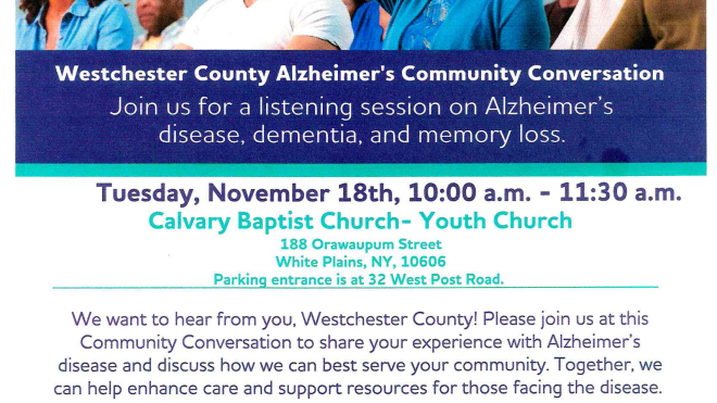 Westchester County Alzheimer's Community Conversation. Join us for a listening session on Alzheimer's disease, dimentia, and memory loss.